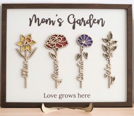Khung gỗ in hình loài hoa theo tháng sinh, là món quà giàu biểu tượng dành tặng mẹ trong dịp Ngày của Mẹ.