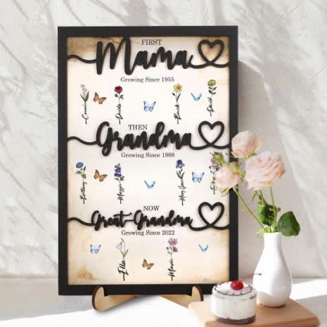 Tấm bảng hoa tháng sinh với thông điệp “First Mom, Now Grandma” ghi dấu cột mốc đáng nhớ của người mẹ trong vai trò mới.